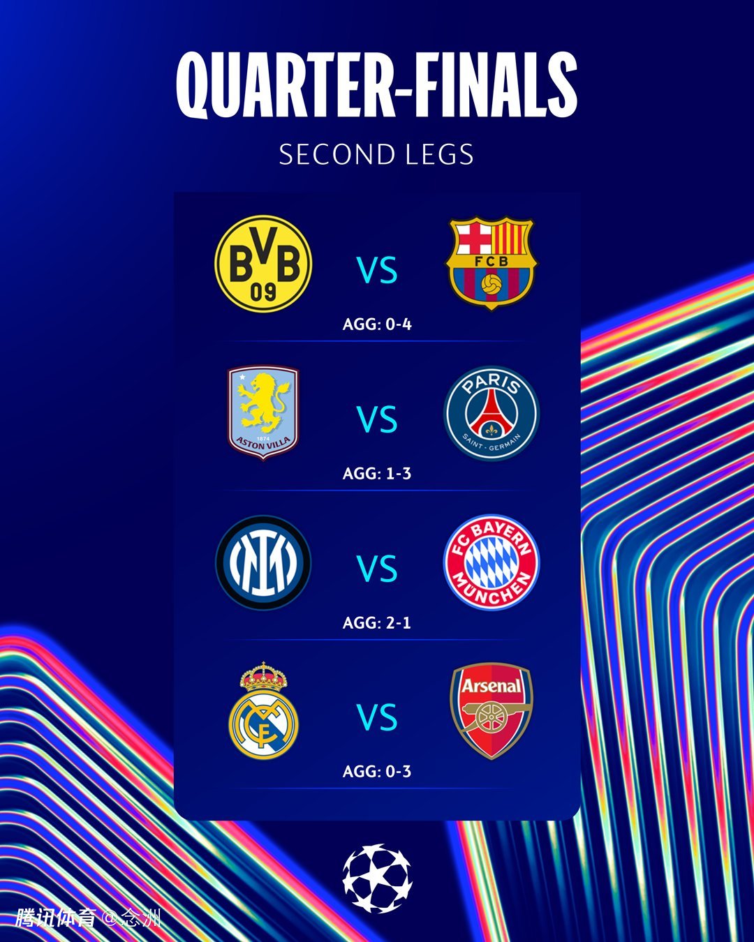 首回合,巴萨4-0多特蒙德,巴黎圣日耳曼3-1阿斯顿维拉,国米2-1拜仁,阿森纳3-0皇马。而明天凌晨,多特主场对阵巴萨,维拉主场迎战大巴黎。