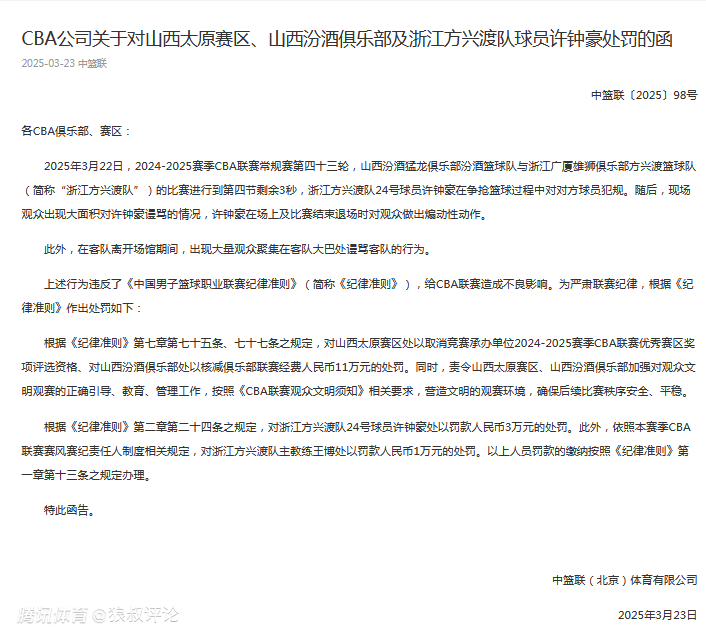 2025-04-15 18:20北京时间4月15日,根据山西男篮官方社交媒体透露,对于昨晚迎战广东男篮观众席出现不文明横幅,CBA公司已对俱乐部及太原赛区处以警告,若再次发生此类违规,将处以核减联赛经费或罚款等处罚。