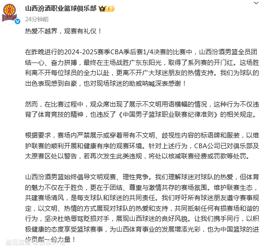 我们呼吁所有球迷朋友遵守赛事规定,以文明、热情的方式展现对球队的热爱和支持,共同抵制任何有损赛场和谐的行为,坚决杜绝辱骂贬损对手,展现山西球迷的良好风貌。让我们携手同行,以积极健康的态度享受篮球赛事,为山西体育事业的发展增添光彩,也为中国篮球的进步贡献一份力量!