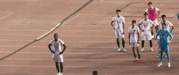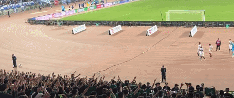 面对球迷不断的加油声,国安球员如同被罚站一样站在场边,还有一位球员将手里的瓶装水撒了一地。短短2分钟之后,国安球员沮丧的离开了球场。