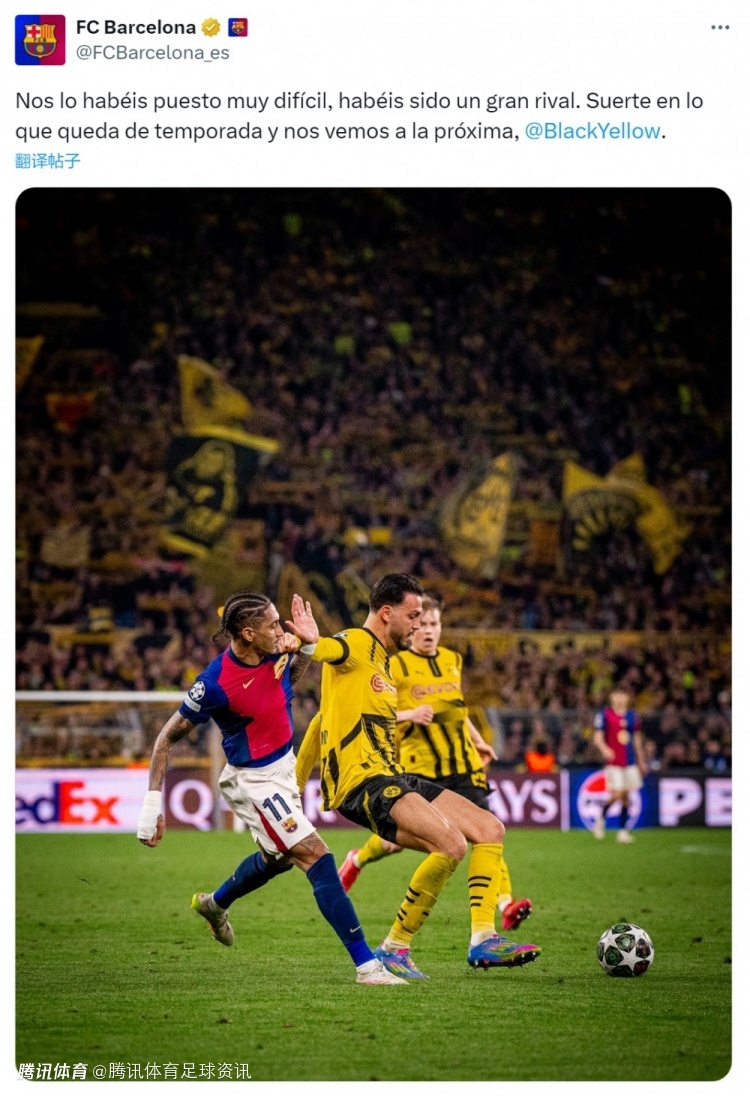 赛后,巴萨官方社媒发文向多特蒙德全队致敬,他们写道: