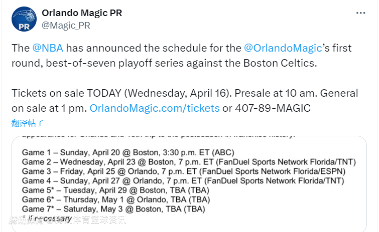 G7(若有需要,5月4日):凯尔特人主场对阵魔术。