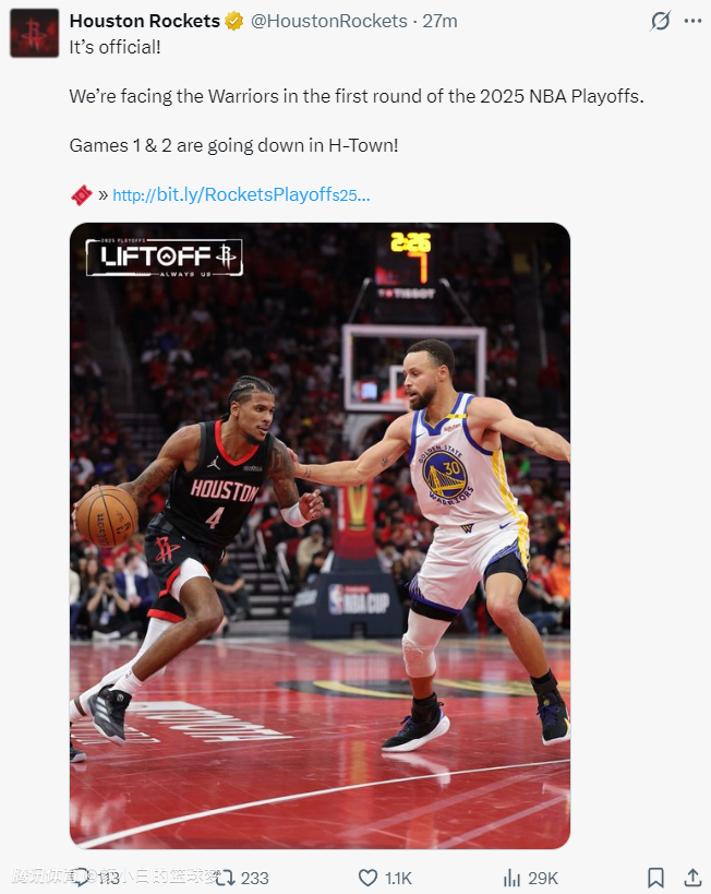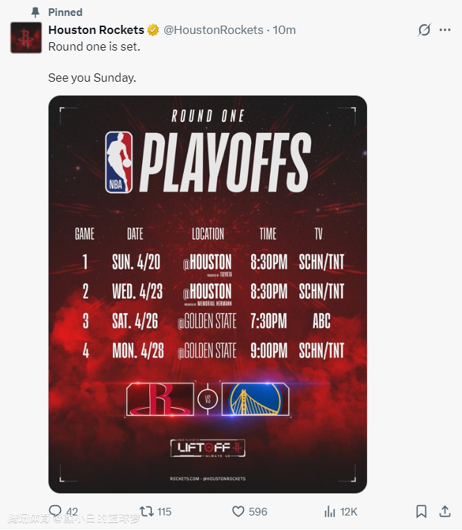 火箭官方也晒出了赛程——4月20日、4月23日(火箭主场);4月26日、4月28日(勇士主场)。