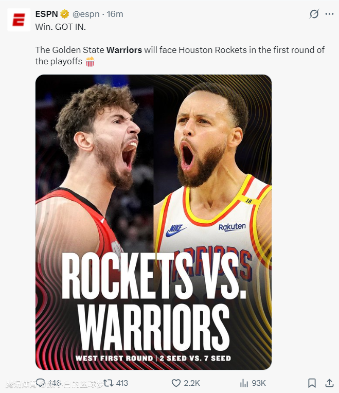 2025-04-16 14:20北京时间4月16日,休斯顿火箭队官方晒出,2025年季后赛首轮,火箭(西部第二)VS勇士(西部第七)。勇士队在刚刚结束的附加赛中险胜了灰熊队,火勇大战将再度上演。