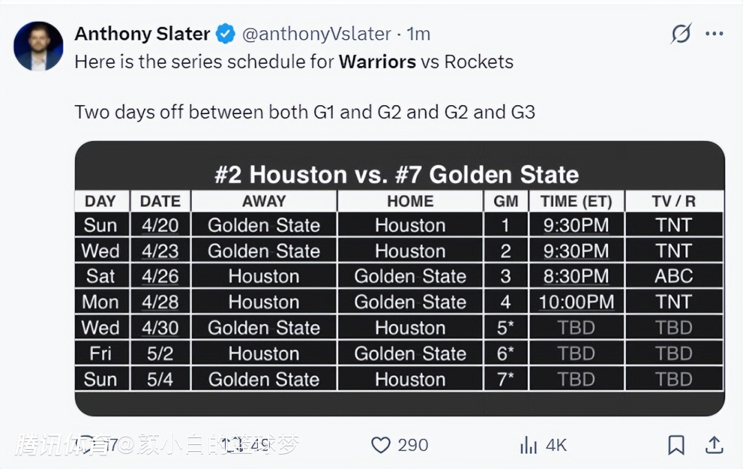 然后4月30日回到火箭主场,5月2日回到勇士主场,如果有抢七5月4日在火箭主场进行。(这里都是美国时间)