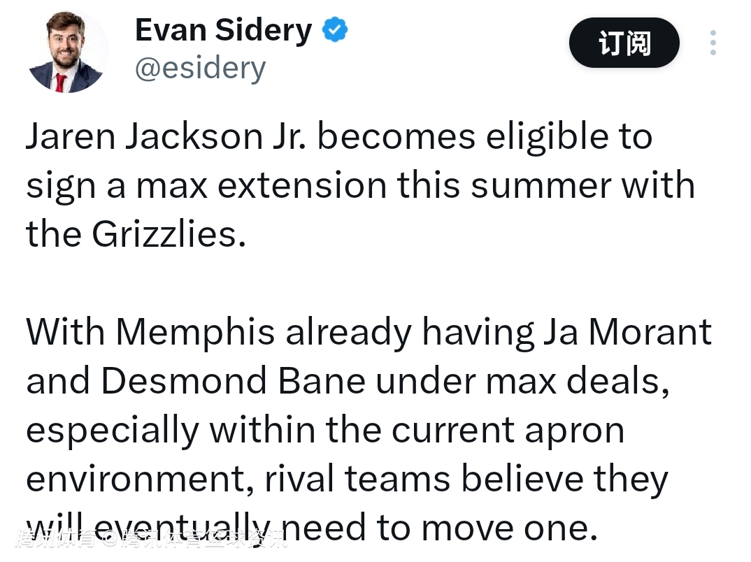 2025-04-16 23:20北京时间4月16日,根据记者Evan Sidery的报道,小贾伦-杰克逊今年夏天有资格与灰熊队签下一份顶薪续约合同。
