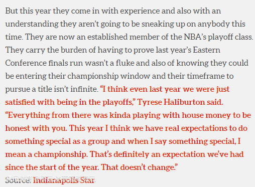 哈利伯顿表示:“我觉得甚至在去年,我们只是满足于打进季后赛。说实话,从那之后的一切都像是在拿别人的钱赌博(意指没有压力)。今年,我认为我们作为一个团队真的期待能做出一些特别的事,而当我说特别的事时,我指的就是夺冠。这绝对是我们从今年年初就有的期望,这一点不会改变。”