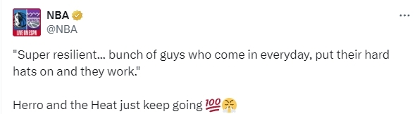 希罗说道:“我们超级有韧性,队里的这群家伙每天都来(训练、比赛),戴上他们的‘安全帽’(喻指认真投入工作),然后努力拼搏。我们这群人每天都努力全力以赴,这赛季并不是我们期望的那样,但我们每天都坚持训练、不断进步。我们有一些有潜力的年轻球员,未来值得期待。”