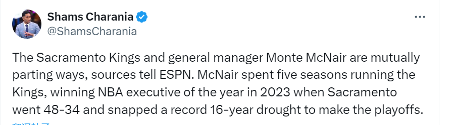 该记者写道:“据ESPN消息人士透露,萨克拉门托国王队与总经理蒙特-麦克奈尔达成协议,双方分道扬镳。麦克奈尔在国王队任职了五个赛季,2023年萨克拉门托国王队取得了48胜34负的战绩,终结了长达16年的季后赛荒,而麦克奈尔也在那一年荣获了年度最佳NBA高管。”
