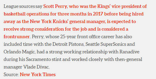 资深高管佩里有望接替国王总经理 前掘金总经理布斯也是热门人选