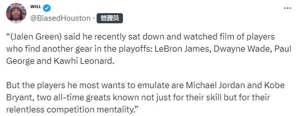 格林还表示,他最想效仿的球员是迈克尔-乔丹和科比-布莱恩特,这两位史上最伟大的球员不仅以其球技著称,更以他们那种永不停歇的竞争心态而闻名。