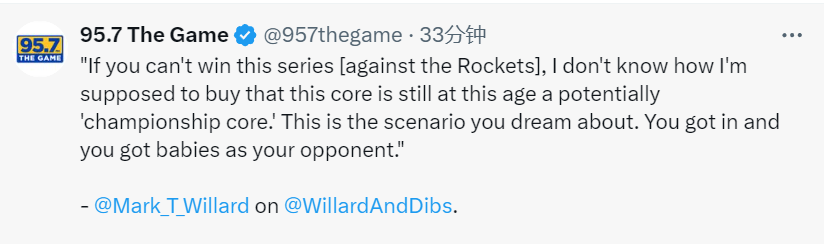 Mark Willard说道:“如果你无法赢下(对阵火箭队的)这个系列赛,我不知道该如何相信,以这个核心阵容如今的年龄,他们仍有可能成为冠军核心阵容。这是你梦寐以求的情况啊。你们打进了季后赛,而且对手还是一群年轻的毛头小子。火箭队投篮不行。他们身材高大而且运动能力强,他们有一堆像乔纳森-库明加那样的球员。”
