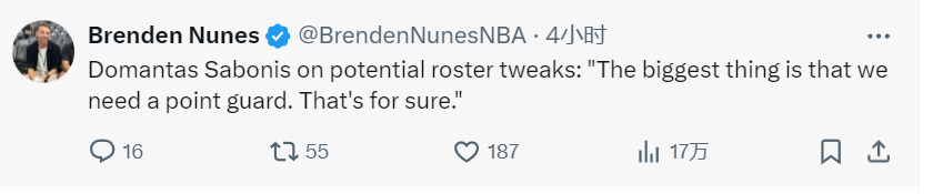 谈及国王潜在的阵容调整时,小萨博尼斯说道:“最重要的是,我们肯定需要一名控球后卫。”