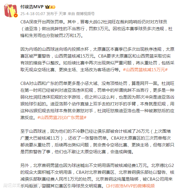 “CBA对山西和广东的罚单更多是小惩大诫、没有顶格处罚,算是网开一面。杜润旺在第一时间已经被判对迪亚洛违体犯规,罚单中的所谓挑衅不当言行,更多是一种弱化杜润旺违体犯规的文字游戏,但之所以这么判,也是因为那次冲突是迪亚洛凶狠抢球引起的。”该媒体人在社媒上写道。