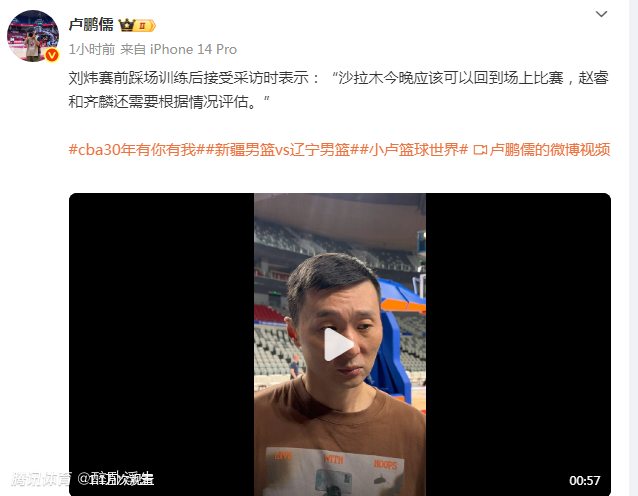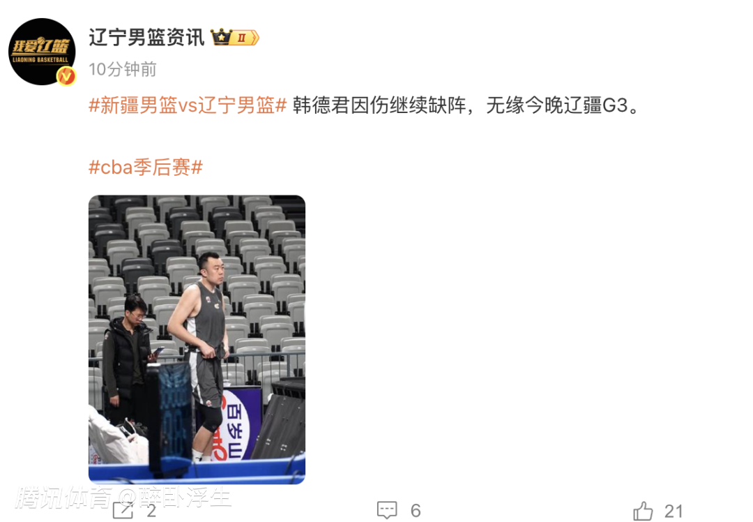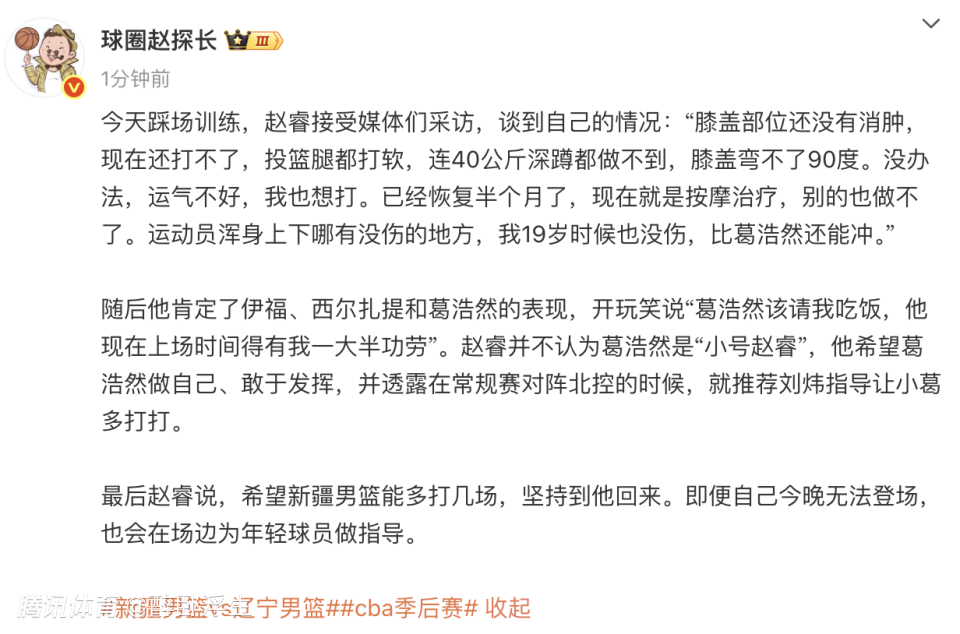 2025-04-18 15:00北京时间4月18日,新疆在季后赛8进4总分0-2落后丢掉赛点,他们在G3回到主场背水一战。赛前采访当中,赵睿透露自己的膝盖部位还没消肿打不了,新疆主帅刘炜接受采访透露,新疆队长阿不都沙拉木伤停一场后将复出,齐麟和赵睿还需要看下午的伤病评估与身体状态,来决定晚上能否出战,至于辽宁队长韩德君继续因伤缺席。
