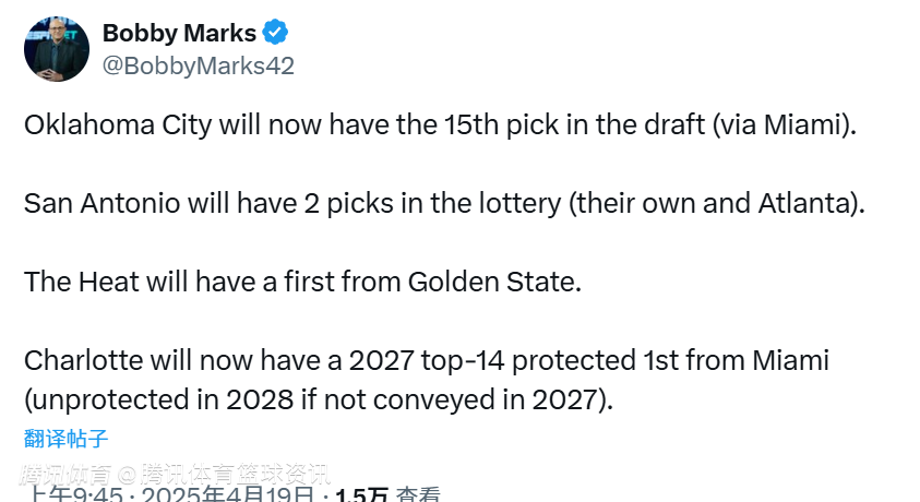 2025-04-19 10:20北京时间4月19日,NBA附加赛继续进行,热火队123-114淘汰老鹰队,以东部8号种子的身份晋级季后赛。而这场比赛过后,NBA薪资专家Bobby Marks更新个人推特,谈到了各队此役后的未来选秀权情况。