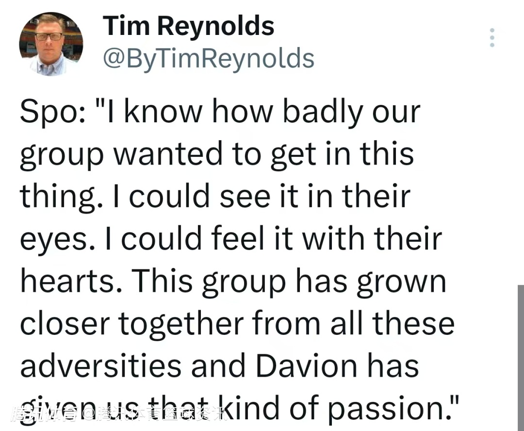 斯波尔斯特拉说道:“我知道我们这支队伍是多么渴望能打入季后赛。我能从他们的眼神里看出来,也能从他们的内心感受到。经历了所有这些艰难险阻,这支队伍变得更加团结紧密了,而达维昂-米切尔给我们带来了那样的激情。”本场比赛中,达维昂-米切尔全场13中5,三分9中4得到16分3篮板5助攻,其中在加时赛命中三记三分杀死比赛。