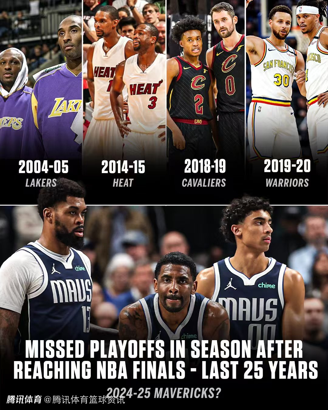 根据数据统计显示,在过去25年里,独行侠队成为了第5支在上个赛季打进NBA总决赛,却在随后一个赛季无缘季后赛的球队。 此前四支球队分别是2004-05赛季的湖人、2014-15赛季的热火、2018-19赛季的骑士和2019-20赛季的勇士。