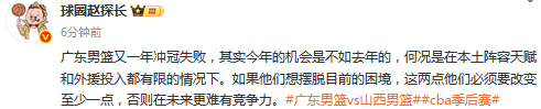 媒体人赵探长发文点评:广东男篮又一年冲冠失败,其实今年的机会是不如去年的,何况是在本土阵容天赋和外援投入都有限的情况下。如果他们想摆脱目前的困境,这两点他们必须要改变至少一点,否则在未来更难有竞争力。