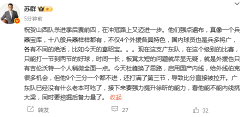 媒体人苏群发文点评说道:祝贺山西队杀进季后赛前四,在冲冠路上又迈进一步。他们强点遍布,真像一个兵器宝库,十八般兵器样样都有,不仅4个外援各具特色,国内球员也是兵多将广,各有不同的绝活,比如今天的葛昭宝。