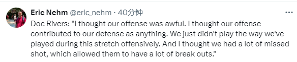 关于本场失利,里弗斯表示:“我觉得我们的进攻糟透了。我认为我们的进攻在很大程度上影响了我们的防守。我们在进攻端完全没有打出这段时间以来的那种表现。而且我觉得我们有很多投篮没进,这就让他们获得了很多快攻机会。”
