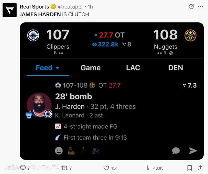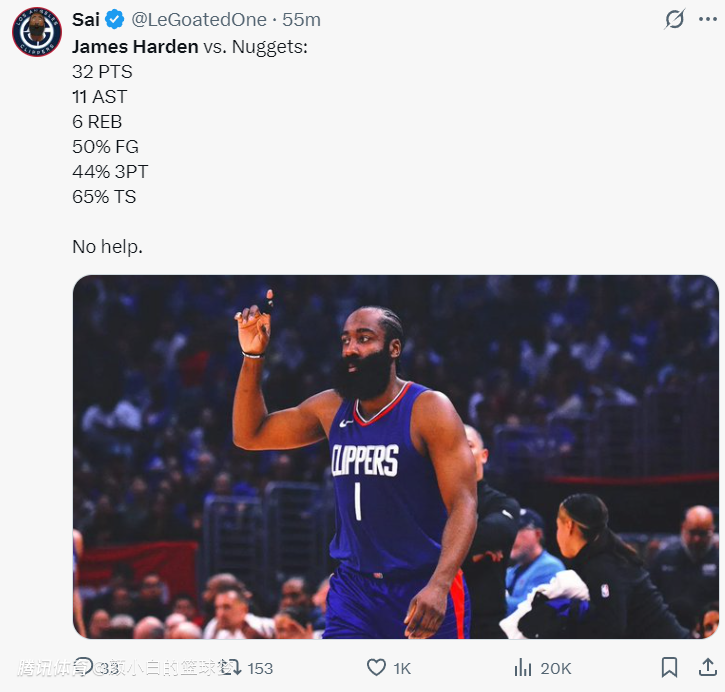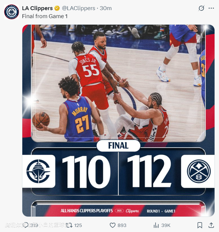 2025-04-20 07:50快船110-112遭掘金逆转,大比分0-1落后。这场比赛肯定有人会说哈登在加时赛还剩9.6秒失误葬送比赛,实际上那个失误不是哈登的问题而是巴图姆传球失误,是巴图姆未能判断好威少的位置。