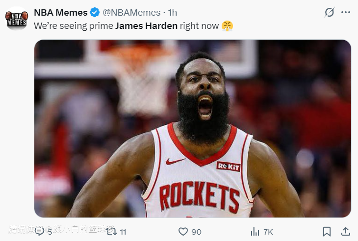 美媒NBA Memes晒出哈登火箭时期照片写道:“我们看到了最出色的哈登表演。”
