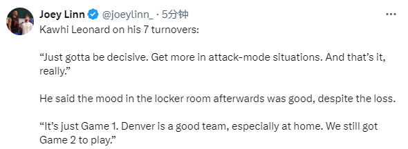 莱昂纳德谈到输掉第一场比赛后更衣室里的总体氛围时说道:“氛围仍然不错。这只是第一场比赛而已。掘金队是一支优秀的球队,尤其是在主场。是的,我是说,我们还有第二场比赛要打。”