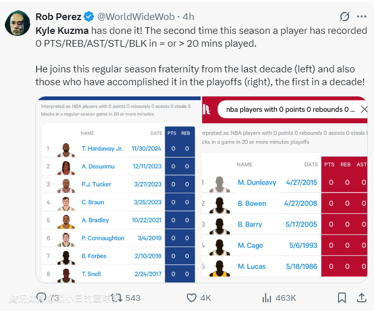 4.库兹马成为季后赛历史登场时间最多拿0分0篮板0助攻0抢断0盖帽的球员;