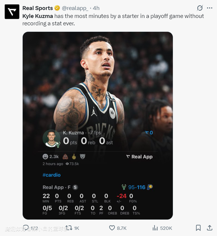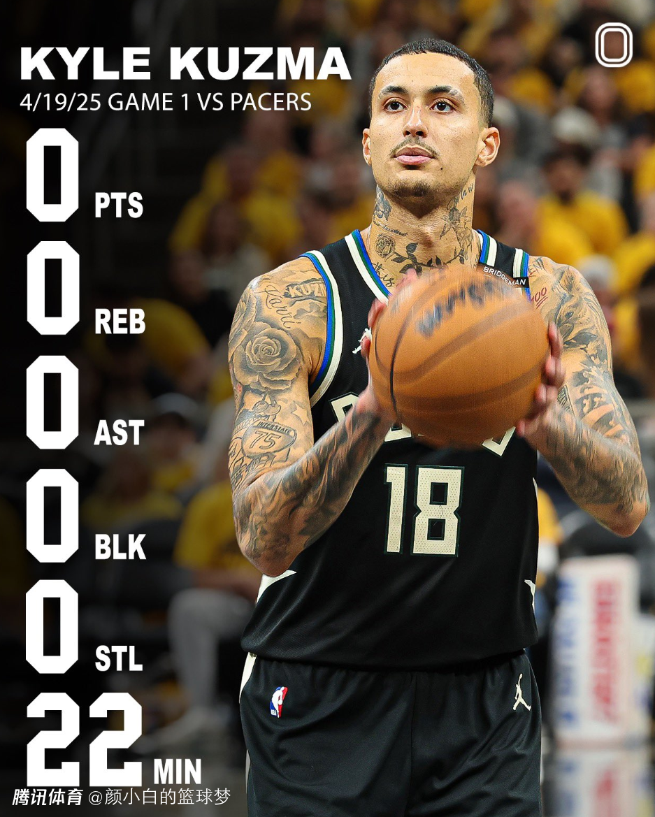 这场比赛本该是扬尼斯最好助力的凯尔-库兹马,登场21分35秒,5中0+三分2中0,拿到0分0篮板0助攻0抢断0失误0盖帽2犯规,这6零数据令人咋舌。