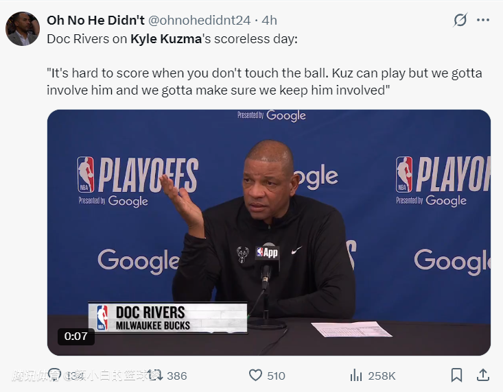 道格-里弗斯赛后吐槽库兹马:“要是不去触球当然无法得分,库兹马是能打球的人,我们一直都希望他参与进来,之后的比赛我们会一直确保他可以参与进来。”