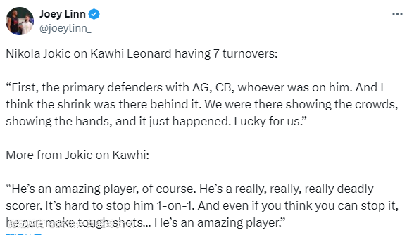 在谈到莱昂纳德出现7次失误时,约基奇说道:“首先,有戈登、布劳恩之类负责主防他的球员表现非常好,而且我觉得我们的防守收缩也起到了作用。我们在他面前进行干扰,伸手阻拦,然后他失误这件事就发生了,这对我们来说很幸运。” “他当然是一名非常出色的球员。他是一个极其、极其、极其致命的得分手,一对一很难防住他。即便你觉得自己能防住,他也能投进高难度的球,他是一名非常出色的球员。”