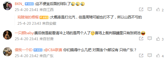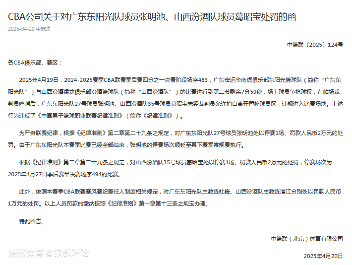 2025-04-21 00:10CBA深夜开出罚单,对于广东主场迎战山西的G3回合,张明池和葛昭宝违规进入到场地开出处罚,分别是张明池,葛昭宝违规离开替补席,进入比赛场地,停赛1场罚款2万,杜锋和潘江作为赛风赛纪责任人,分别处以罚款1万的处罚。