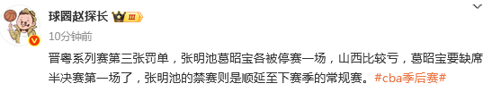 媒体人赵探长发文点评说道:晋粤系列赛第三张罚单,张明池葛昭宝各被停赛一场,山西比较亏,葛昭宝要缺席半决赛第一场了,张明池的禁赛则是顺延至下赛季的常规赛。