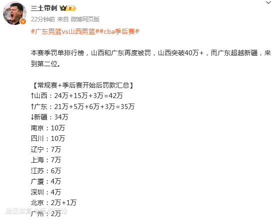 媒体人三土带刺发文点评说道:本赛季罚单排行榜,山西和广东再度被罚,山西突破40万+,而广东超越新疆,来到第二位。