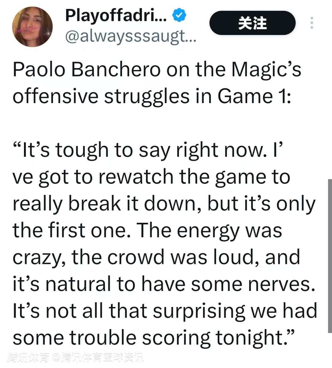 谈到魔术队在第一场比赛中的进攻困境,班凯罗表示:“现在很难说。我得重新看一遍比赛才能真正分析清楚,但这只是第一场比赛。现场气氛热烈,观众呼声很高,有点紧张是很正常的。我们今晚在得分上遇到一些困难,这并不太令人惊讶。”