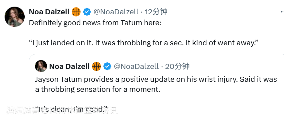 塔图姆透露了自己在比赛中扣篮时被犯规后重重摔倒的后续情况,他的手腕接受了X光检查,他说道:“结果没什么问题。我就是摔下去的时候压到了手腕,当时疼得厉害,很快就缓解了。”