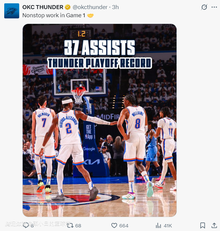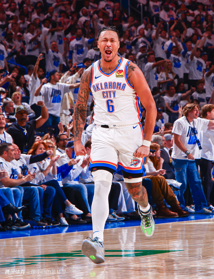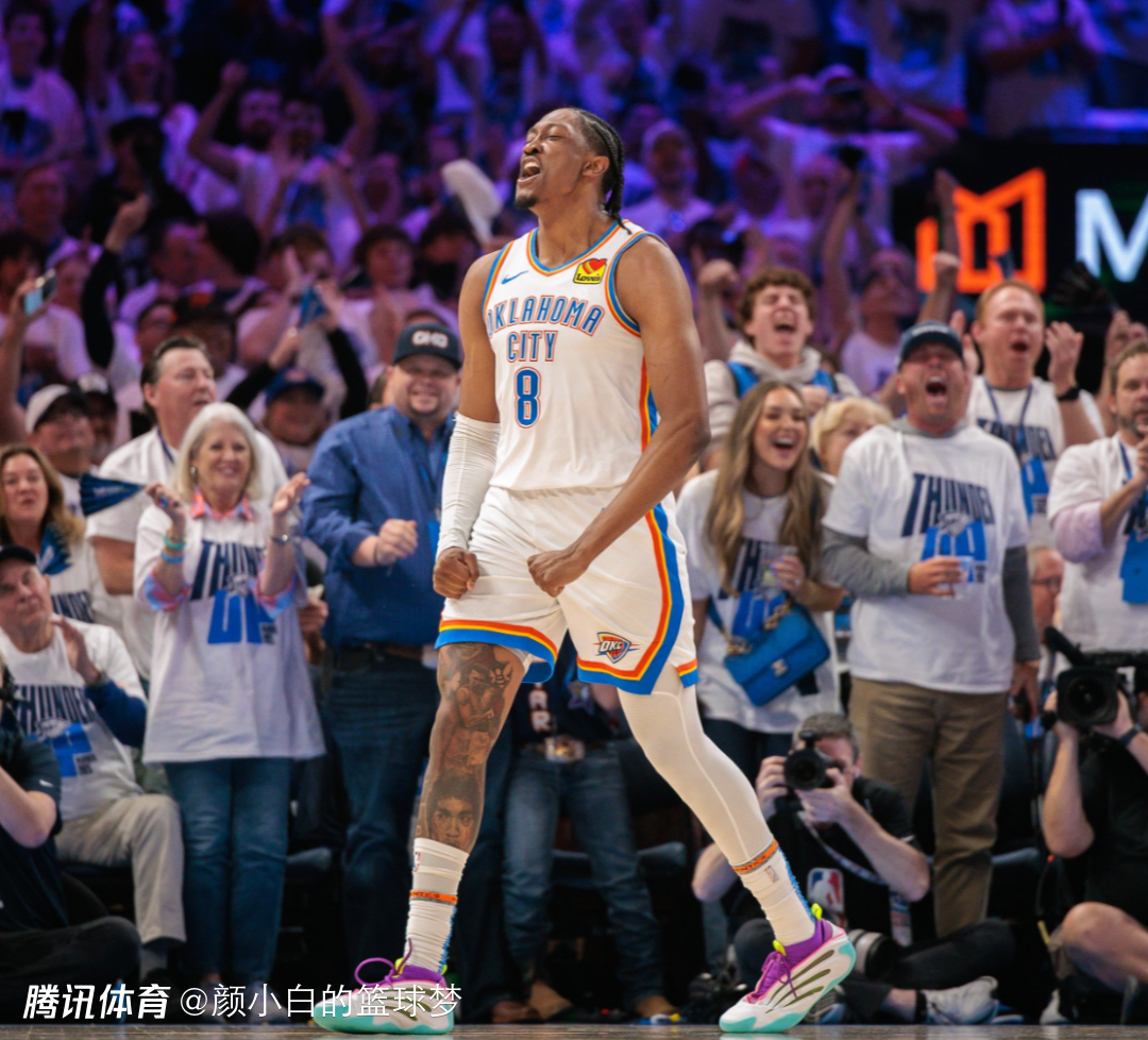 这场比赛雷霆是多点开花,SGA只打23分钟拿15分5助攻,杰威25分钟20分6助攻5篮板,霍姆格伦21分钟拿19分10篮板1抢断2盖帽。哈腾21分钟拿14分8篮板5助攻1抢断,多尔特21分钟拿12分3篮板2助攻,威金斯26分钟拿21分4篮板。雷霆是13人轮换,一场酣畅淋漓的大胜。