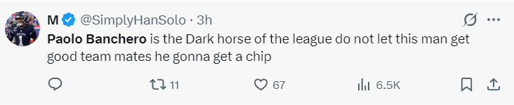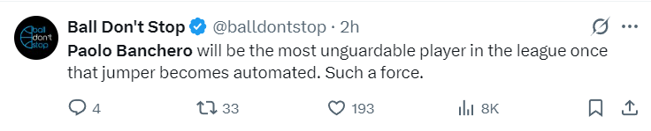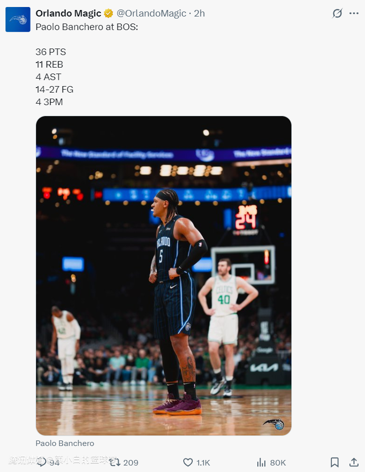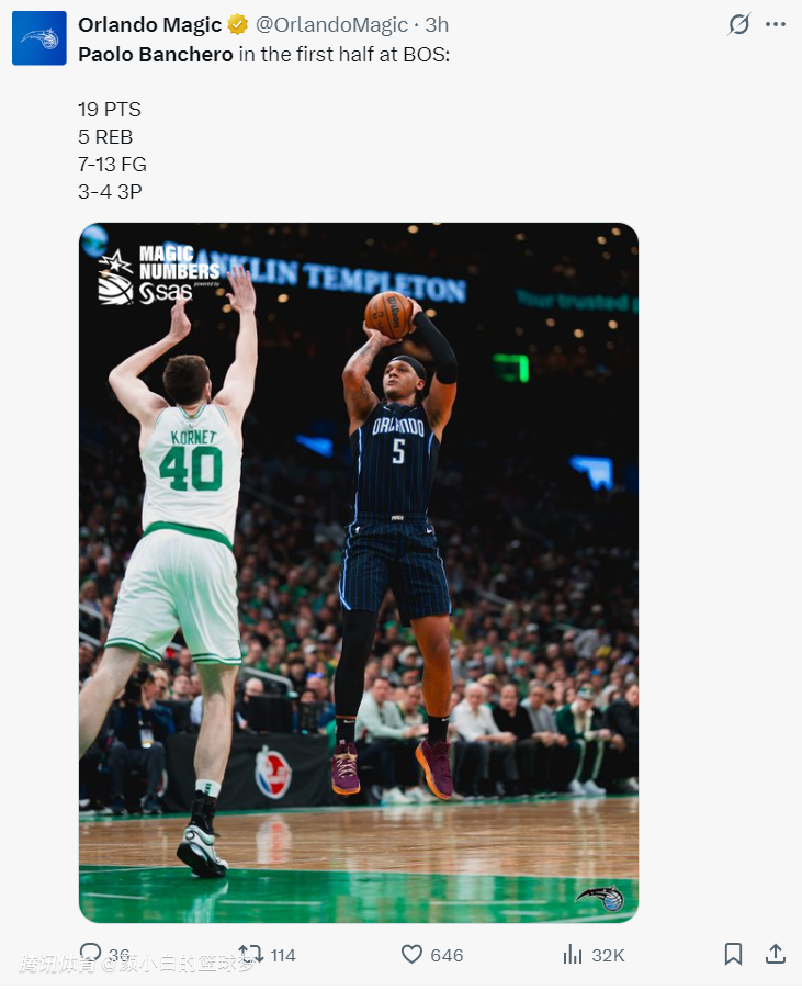 不过保罗-班凯罗还是延续了他自己的高光状态,仅是上半场他就13中7,三分4中3,拿到19分5篮板,要知道魔术全队上半场合计只拿到49分,班凯罗就是第一进攻箭头。