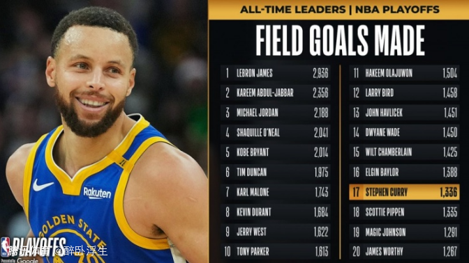 此外,库里季后赛运动进球数,超越公牛6冠名宿皮蓬,升至季后赛历史第17位。