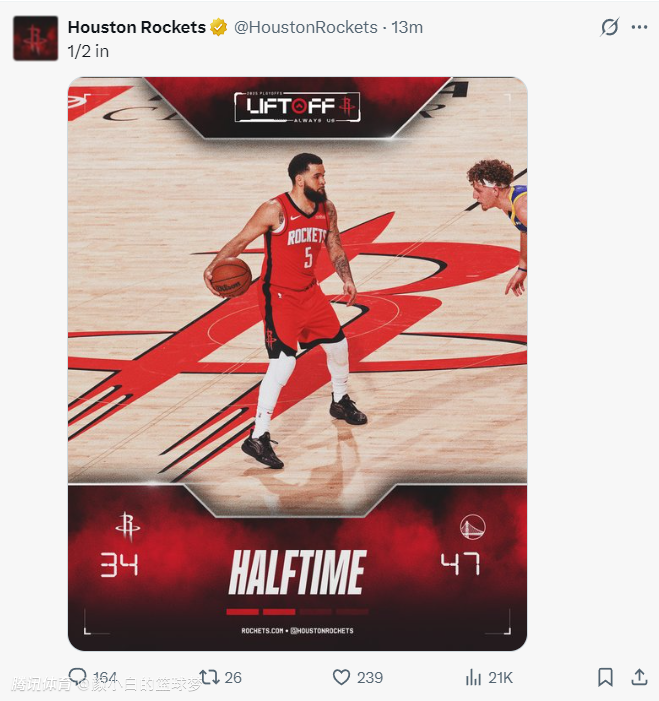 2025-04-21 12:20北京时间4月21日,NBA季后赛,勇士队客场以95-82击败火箭,大比分1-0领先。首节火箭领先3分,第二节火箭13-29崩盘被反超13分之多,第三节火箭一度落后23分但三节打完缩小到9分,末节火箭一度缩小到4分出现了两个失误再度被拉开,比赛完结。