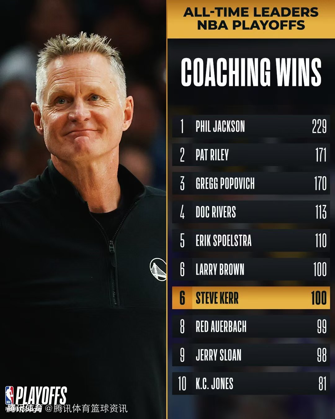 根据数据统计显示,凭借本场胜利,金州勇士主帅科尔收获职业生涯第100场季后赛胜利,在季后赛教练胜场数榜单上升至NBA历史第六位,与拉里-布朗并列。