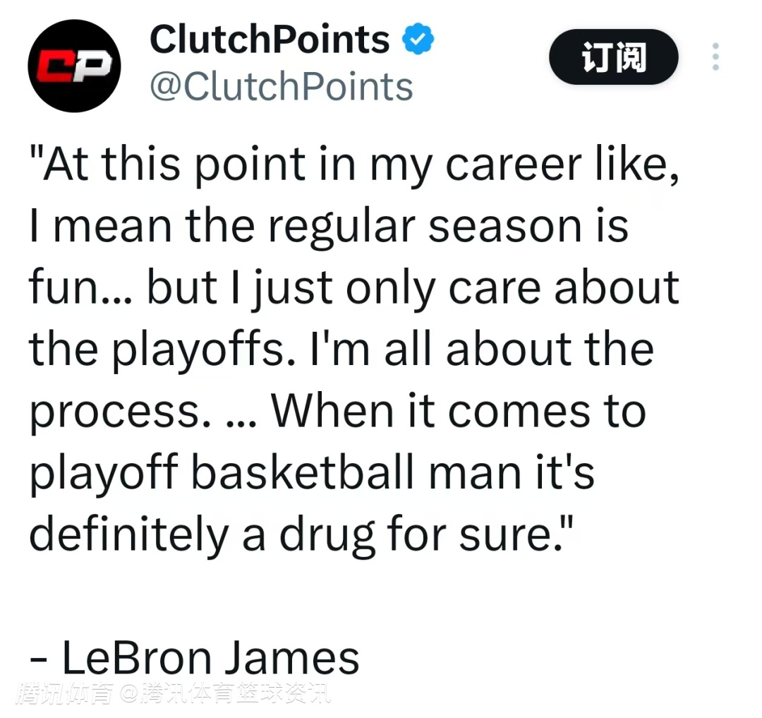 詹姆斯说道:“在我职业生涯的这个阶段,我的意思是常规赛很有趣,但我只在乎季后赛。我关注的就是这个过程。说到季后赛篮球,伙计,那绝对就像让人上瘾的东西。”