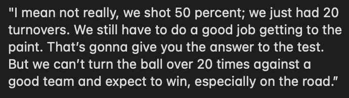 记者追问他从今天比赛的投篮选择角度来看,球队有哪些方面可以改进时,泰伦-卢说道:“我觉得并没有太多要改进的,我们的投篮命中率达到了50%,只是出现了20次失误。我们仍需做好突破到内线进攻的工作,这会是解决问题的关键。但面对一支优秀的球队,我们不能出现20次失误还指望能赢球,尤其是在客场作战的时候。”