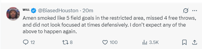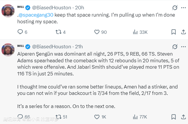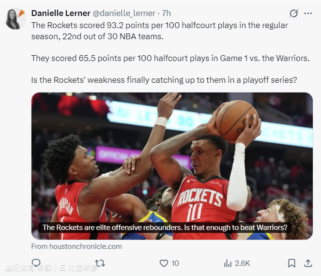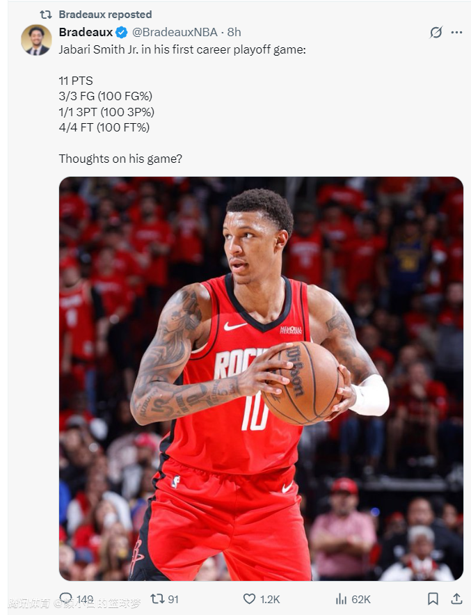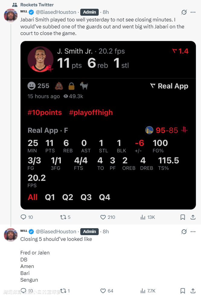 休媒BiasedHouston表示:小贾对阵勇士的比赛太出色了,为什么在决胜时刻要将他换下?如果是我的话我会换下一个后卫范弗利特/格林其中一个被换下,让小贾+申京继续待在场上。