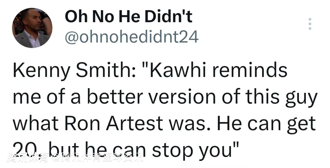 赛后,篮球评论员肯尼-史密斯在直播节目中评价了莱昂纳德的表现,他说道:“莱昂纳德让我想起了一个升级版的阿泰斯特。他能得20分,还能防住你。”