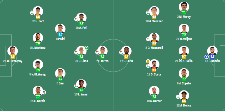 巴塞罗那(4-2-3-1):什琴斯尼;埃里克-加西亚,阿劳霍,伊尼戈-马丁内斯,福特(77'赫拉德-马丁);加维,佩德里;亚马尔(86'德容),奥尔莫(62'费尔明-洛佩斯),安苏-法蒂(62'拉菲尼亚);费兰-托雷斯(77'保-维克托)