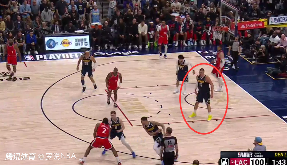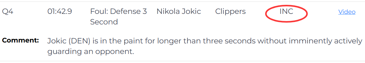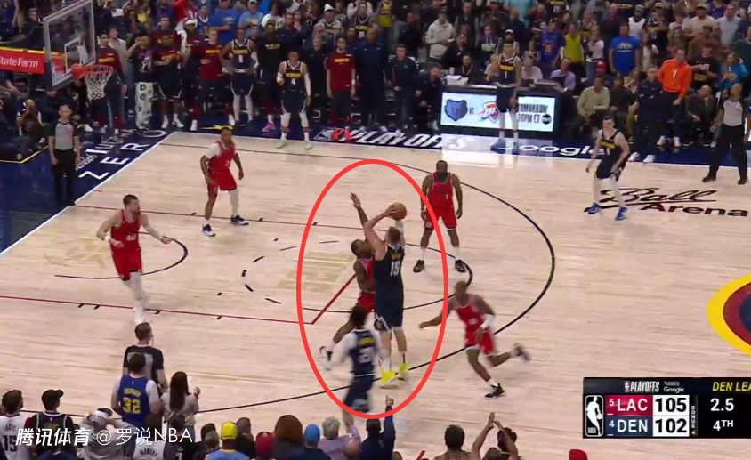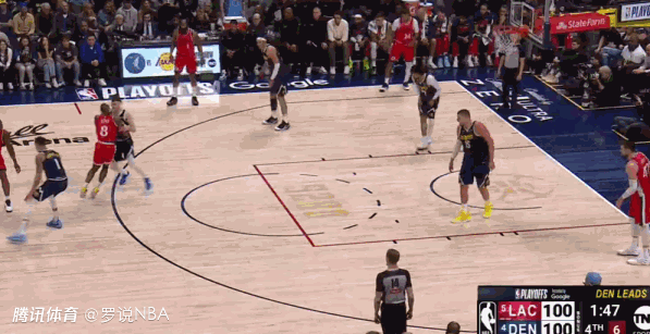 最后两分钟唯一一次漏判,出现在距离比赛结束还有1分42秒时。当时场上比分是100-100,约基奇在没有积极防守对方球员的情况下,在己方禁区停留时间超过三秒,这是一次漏吹的防守三秒违例。快船本该获得一次罚球机会。这次漏判是快船吃亏,掘金获利。