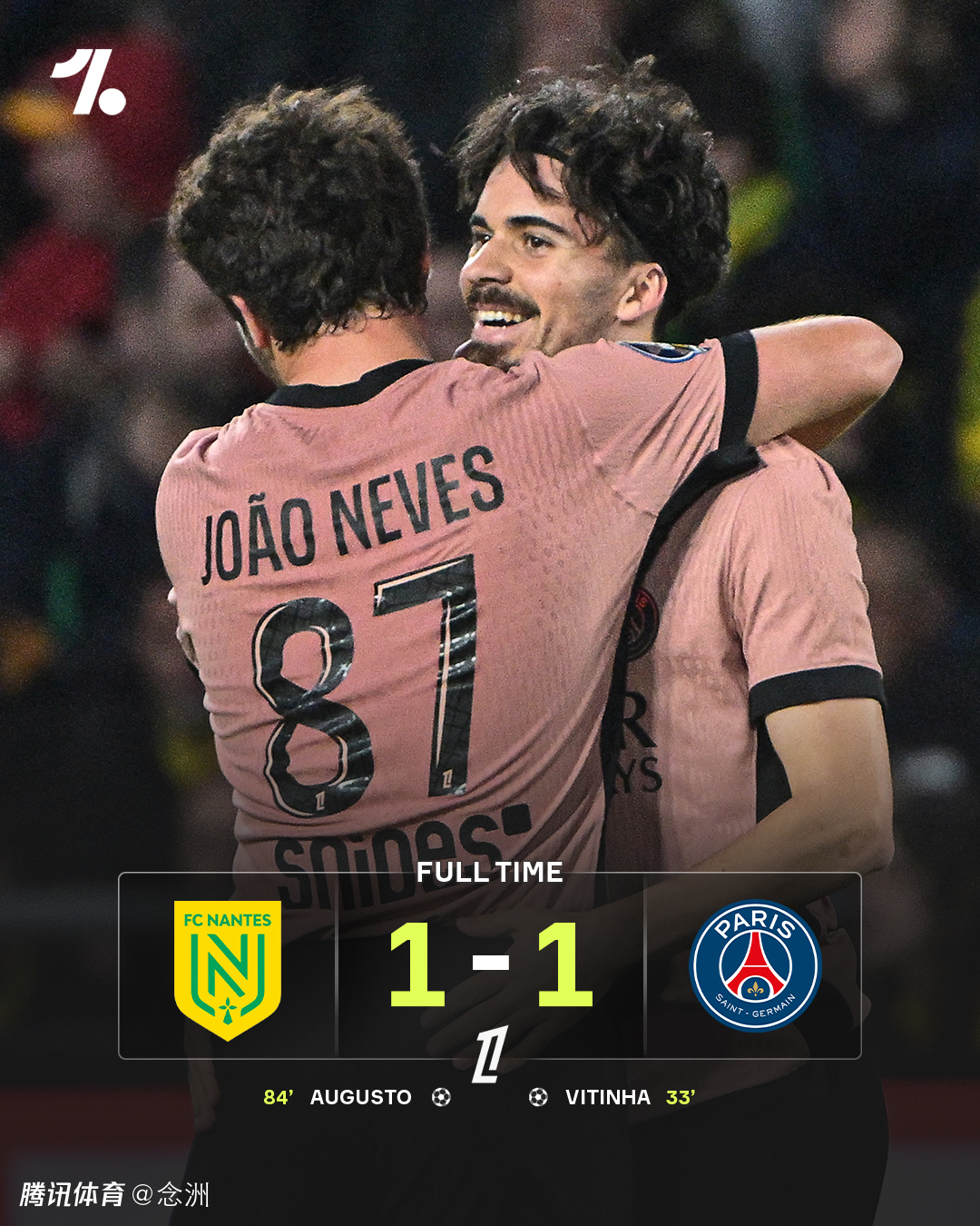 法甲第29轮,巴黎圣日耳曼客场1-1战平南特,联赛10连胜终结,维蒂尼亚帮助巴黎取得领先。道格拉斯-奥古斯托帮助南特扳平。