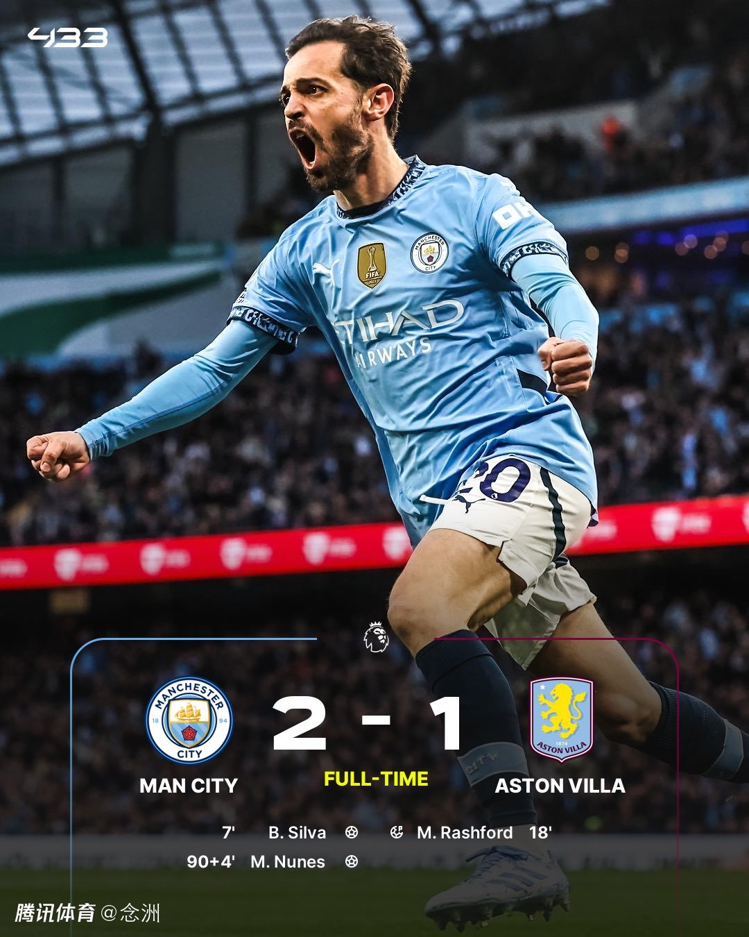 英超第34轮,曼城主场2-1战胜维拉,终结维拉英超5连胜,排名暂升第3。拉什福德开场中柱,B席破门,迪亚斯送点,拉什福德点射扳平。马尔穆什破门但越位无效;多库94分钟助攻努内斯绝杀。
